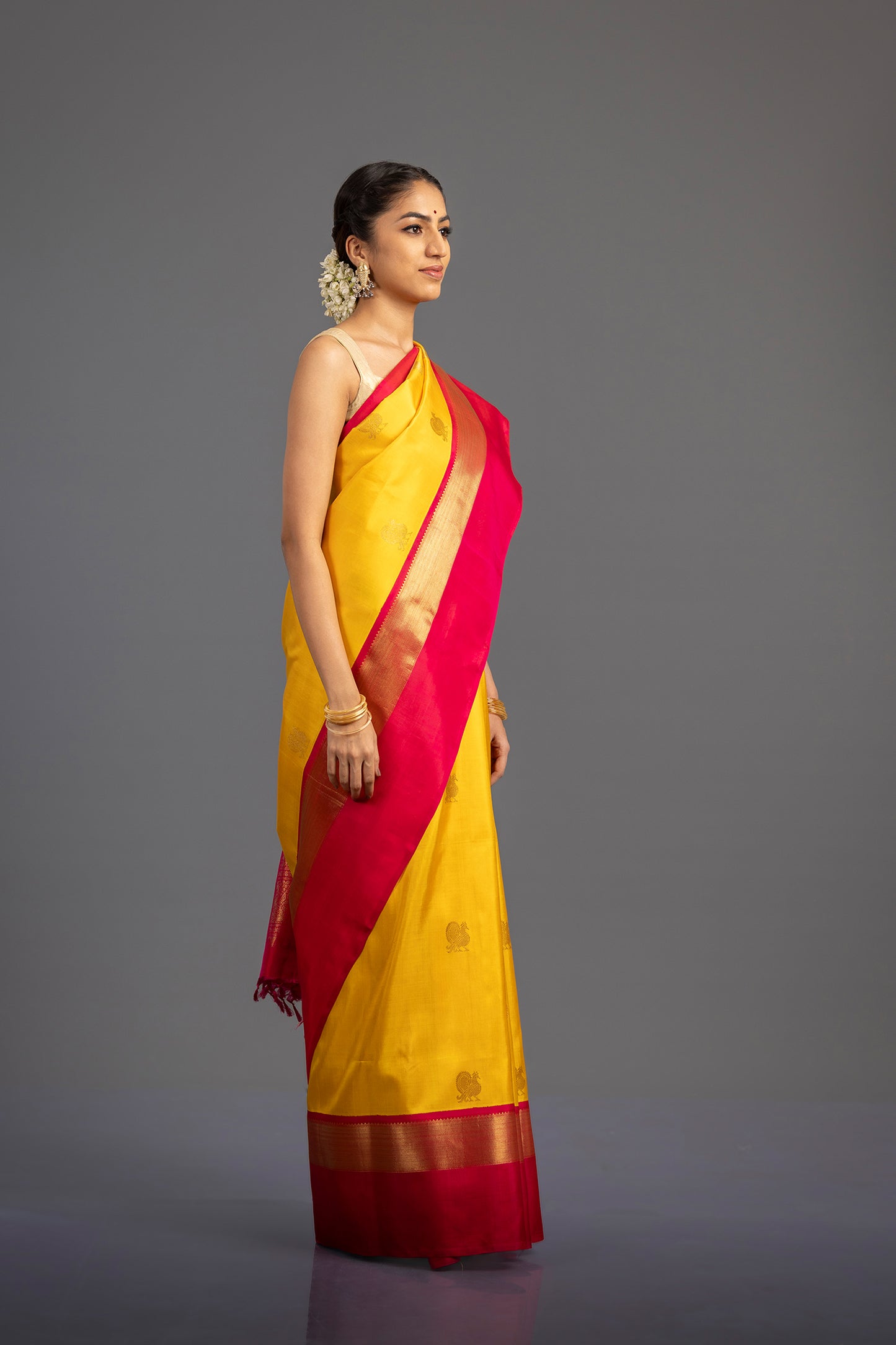 Kanjivaram silk saree in yellow woven with intricate peacock motifs in zari. Bordered with a contrasting pink by the delicate gold Zari Kadi. Pallu of the saree is a rich pink with a peacock border.