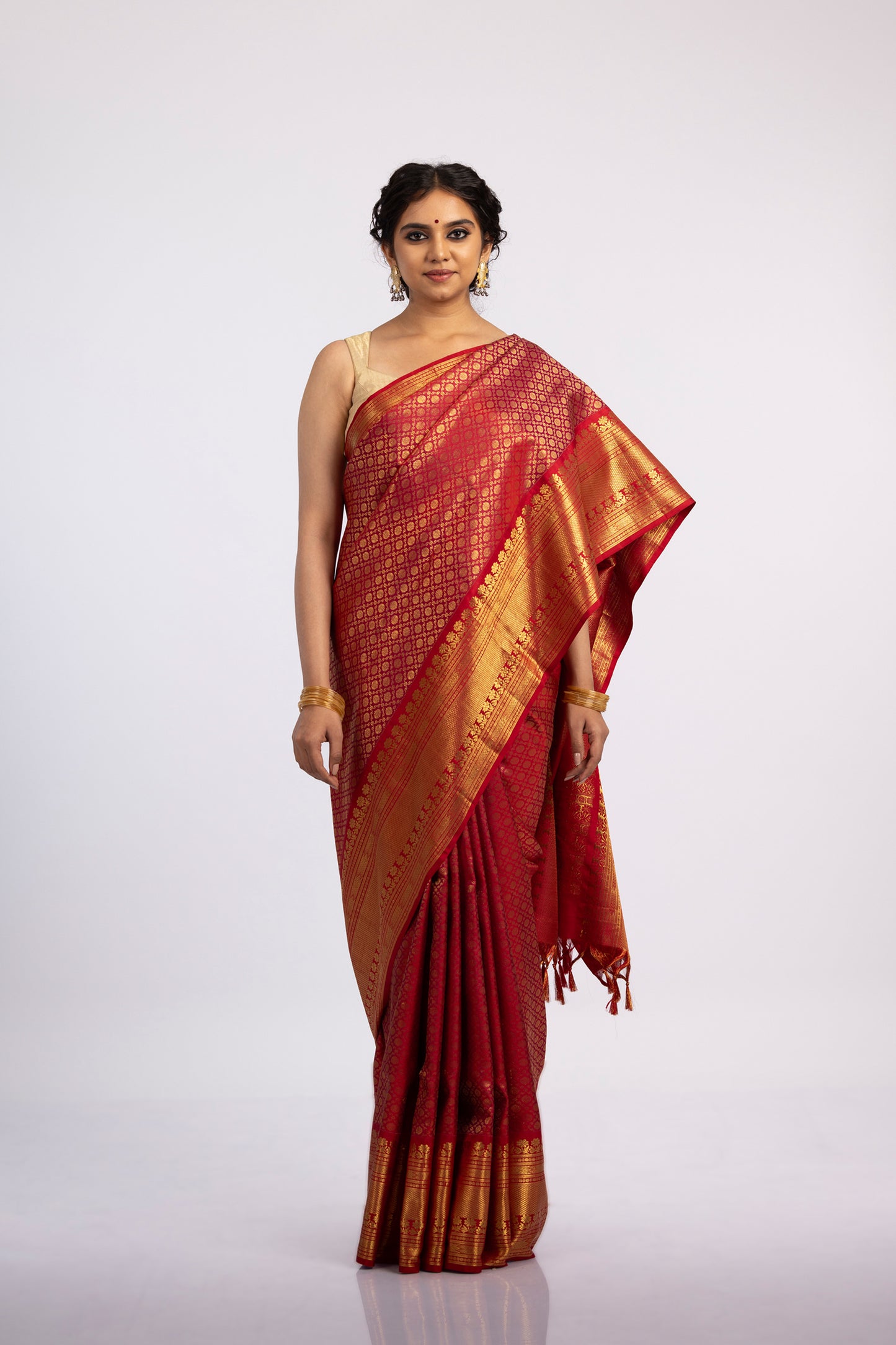 Kanjivaram handwoven saree in red woven with a floral check pattern, each check embellished with buttas. Self-border is beautifully created with Zari floral designs and a kadi border. Pallu has all-over brocade pattern, floral border, and a rudraksha border.