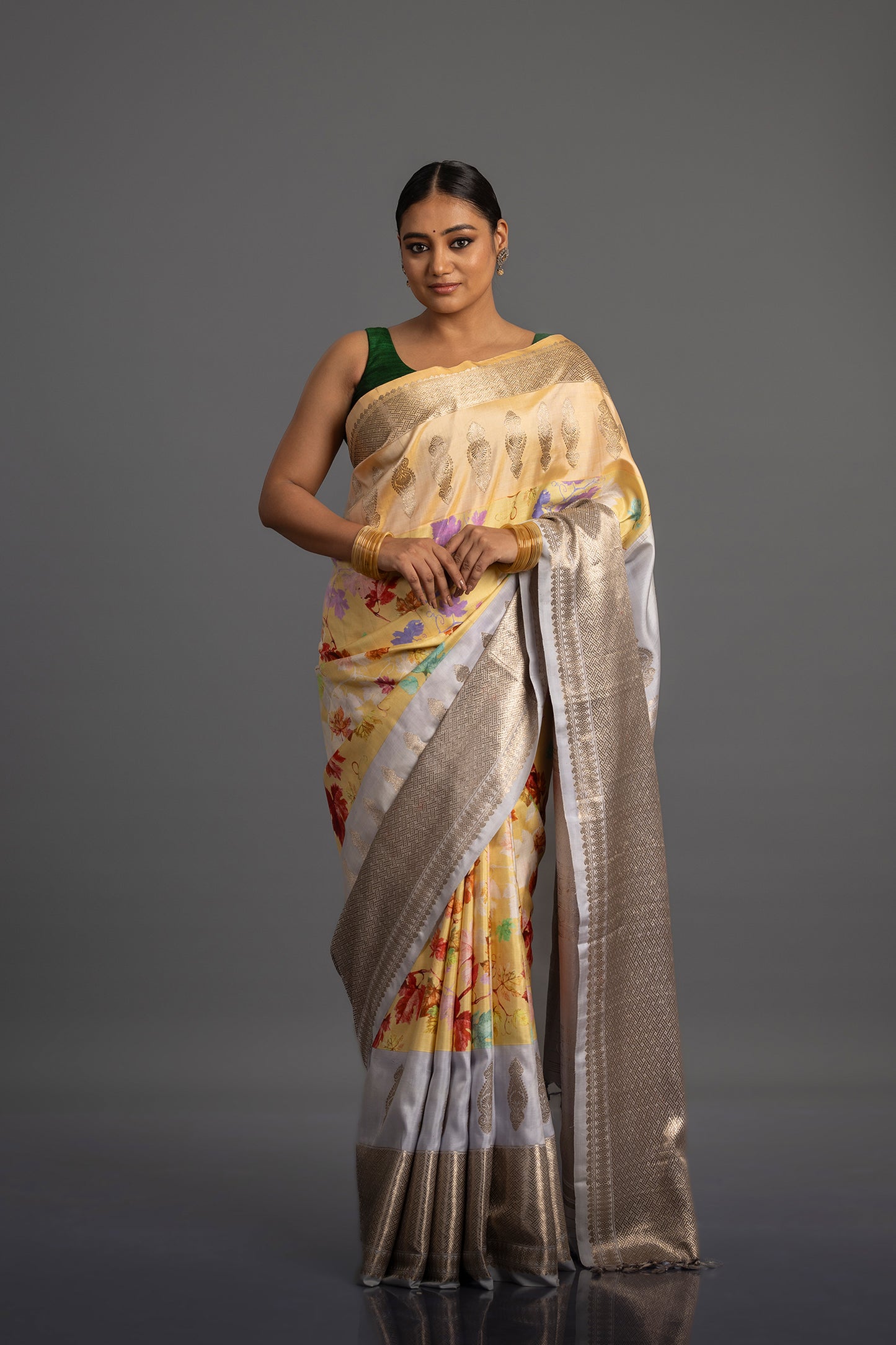 Handwoven Kanjivaram saree in yellow with all-over print. Ganga Jamuna border combines light peach and powder blue tones and paisley designs. Pallu is powder blue and has geometric designs woven with gold zari.