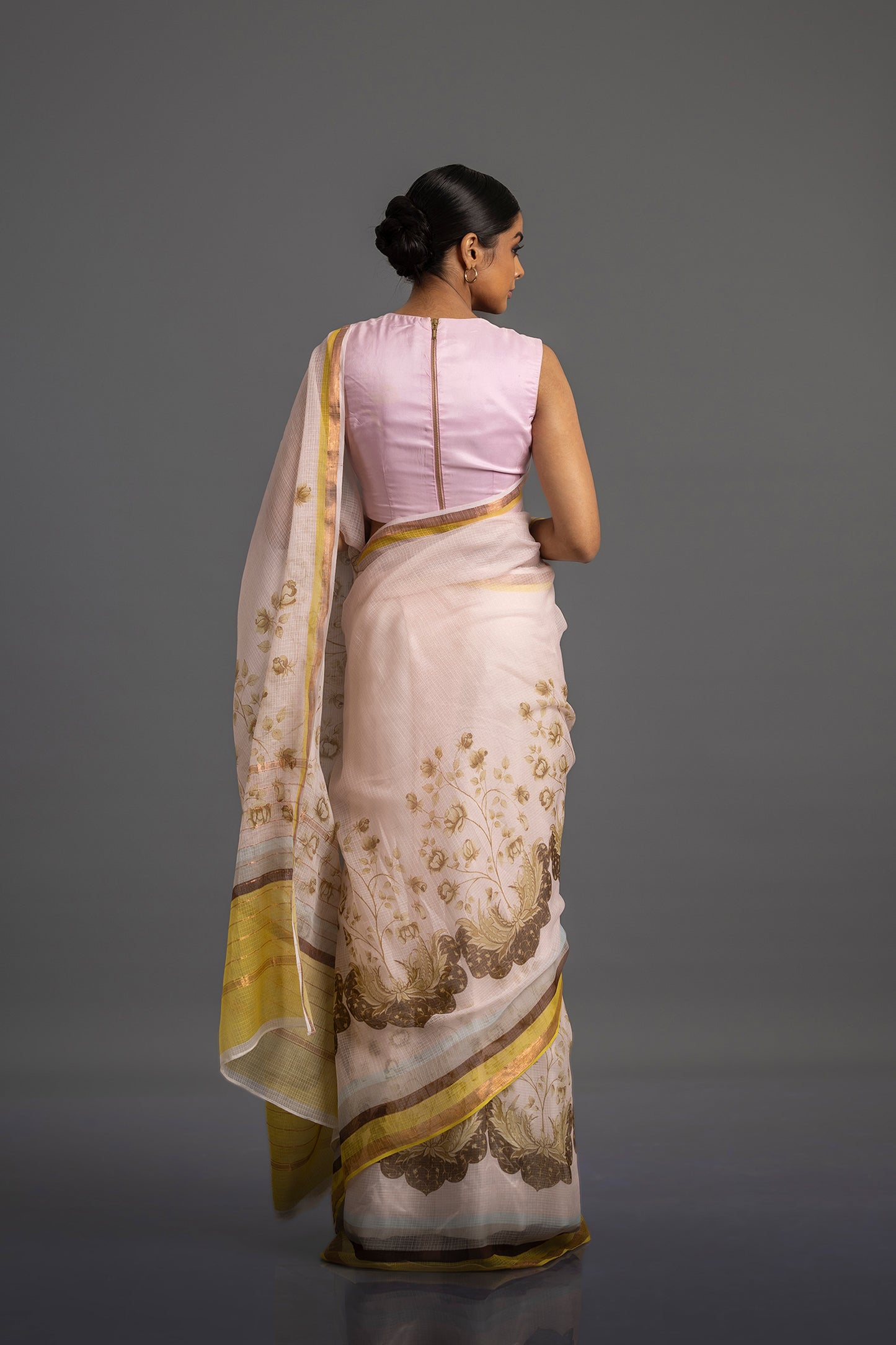 Kota handwoven off-white printed saree with floral pattern print. Gold, yellow, and brown printed kadi border. The pallu has Zari pinstripes and yellow kadi border.