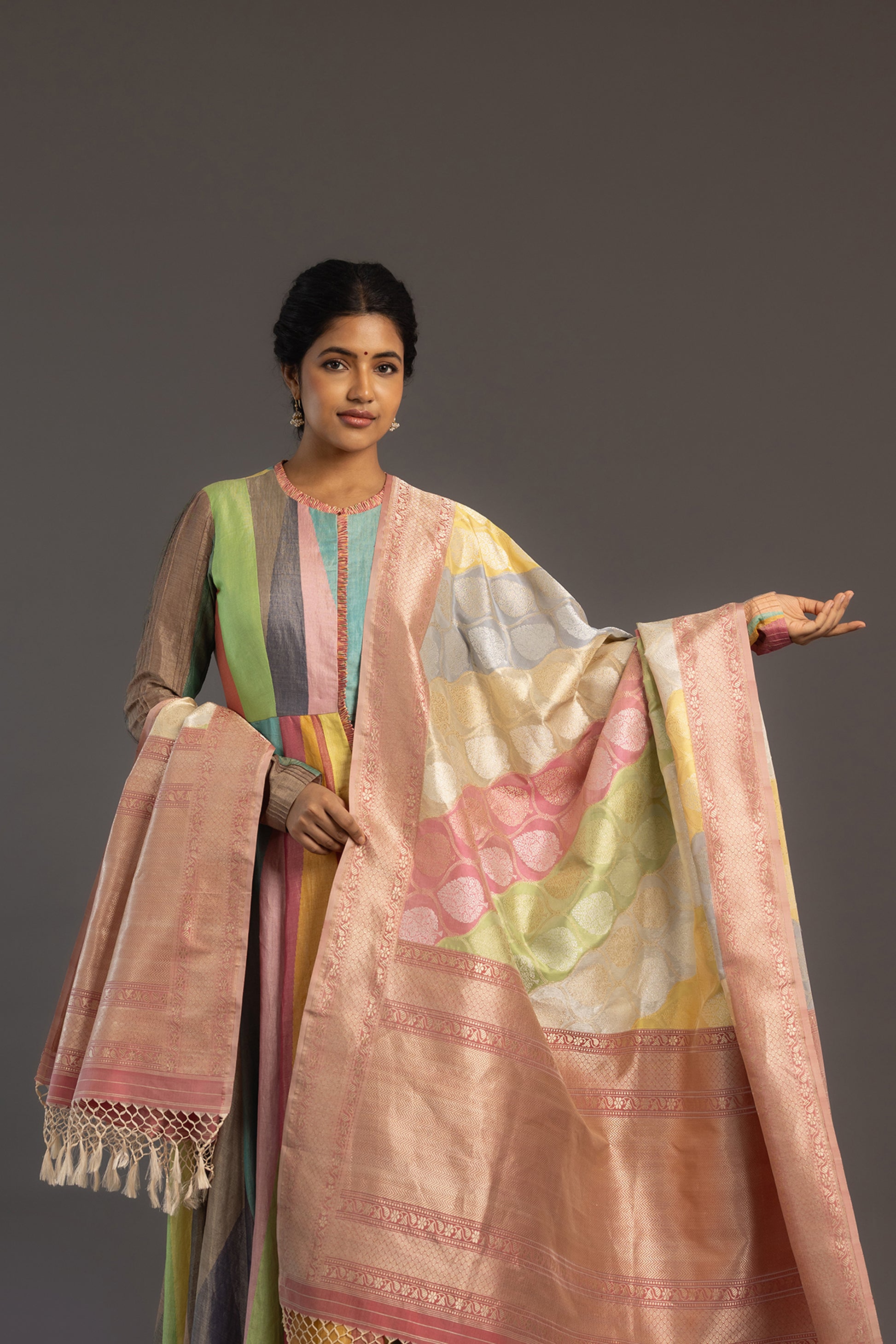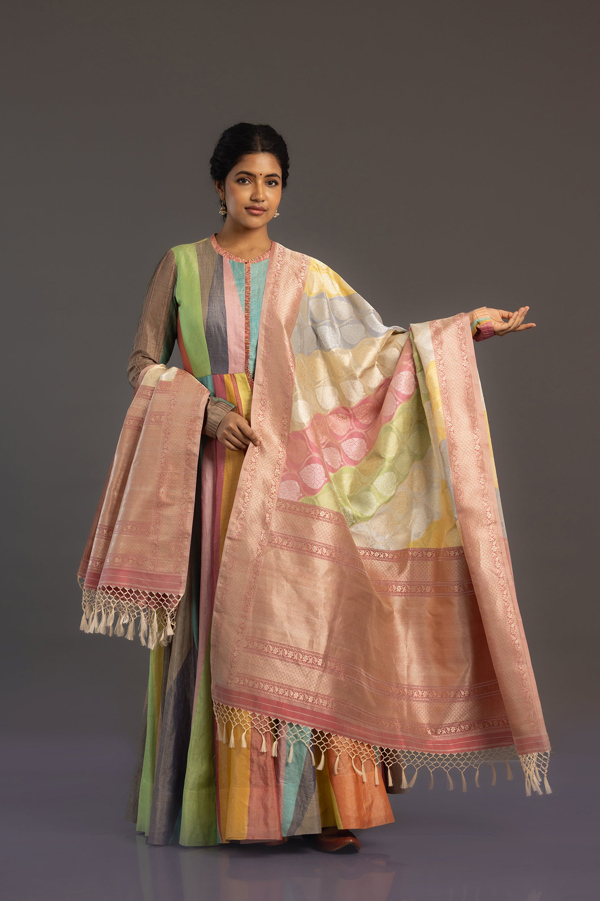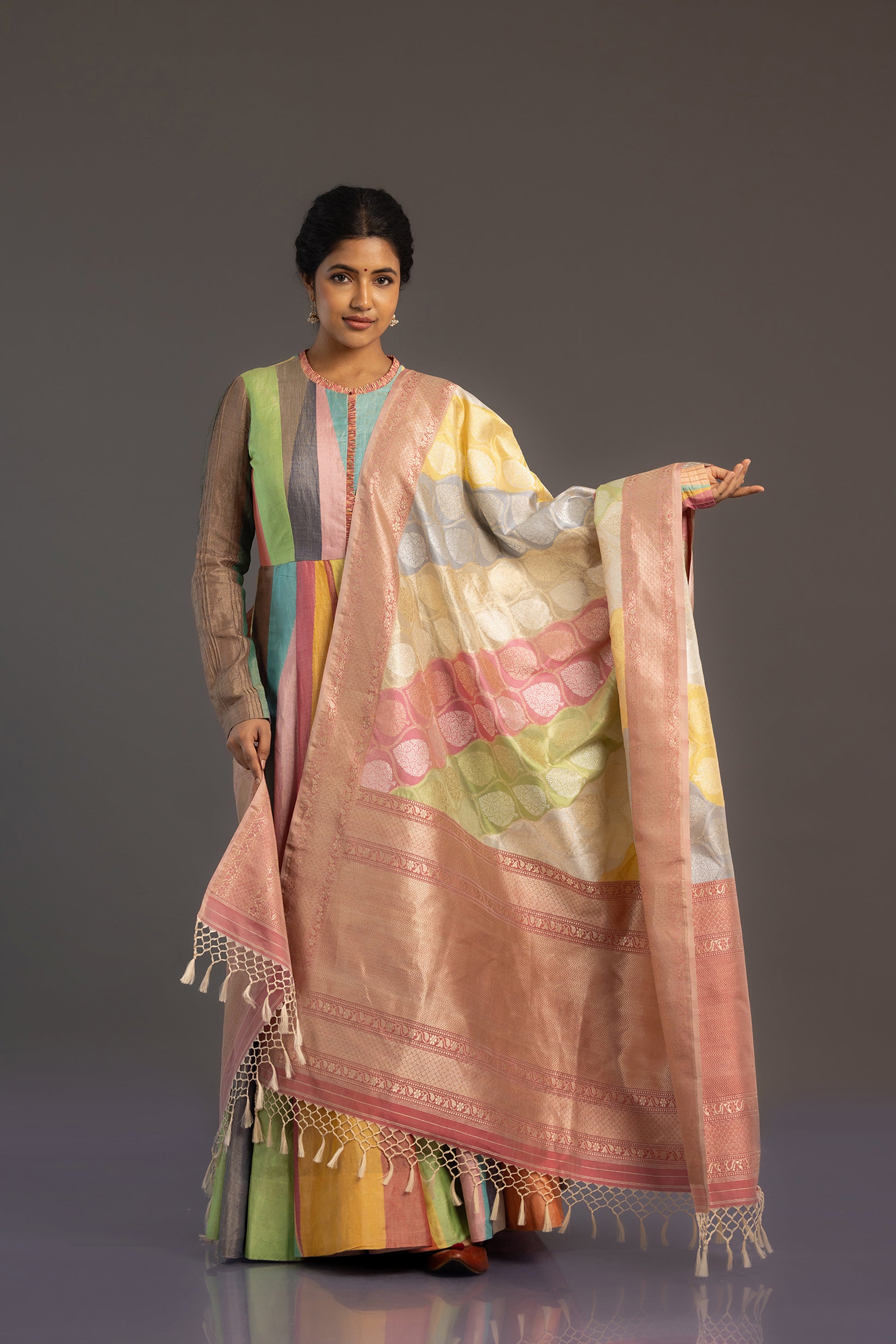 Handwoven Benarasi dupatta with a pastel-shaded Rangkat design and Zari paan (leaf) designs. Peach-pink border has a woven check pattern with a phool-patti (floral vine) border. Pallu combines check patterns, phool-patti borders, and woven chevron stripes.