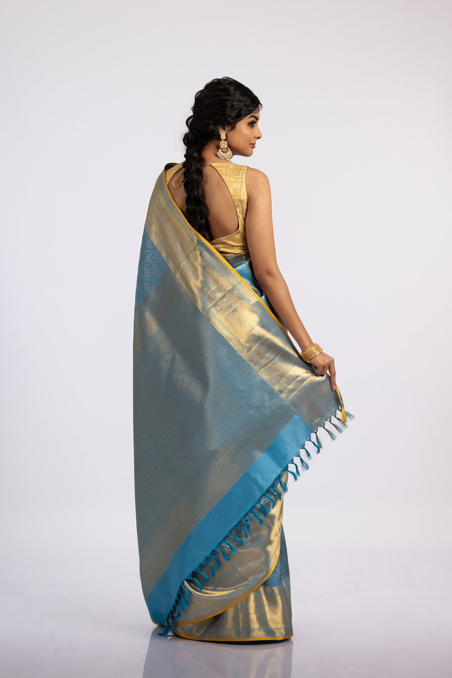 Kanjivaram handwoven saree in light blue with an all-over check pattern and buttas woven with Zari. Zari kadi border and a yellow selvedge. Kanjivaram pallu.