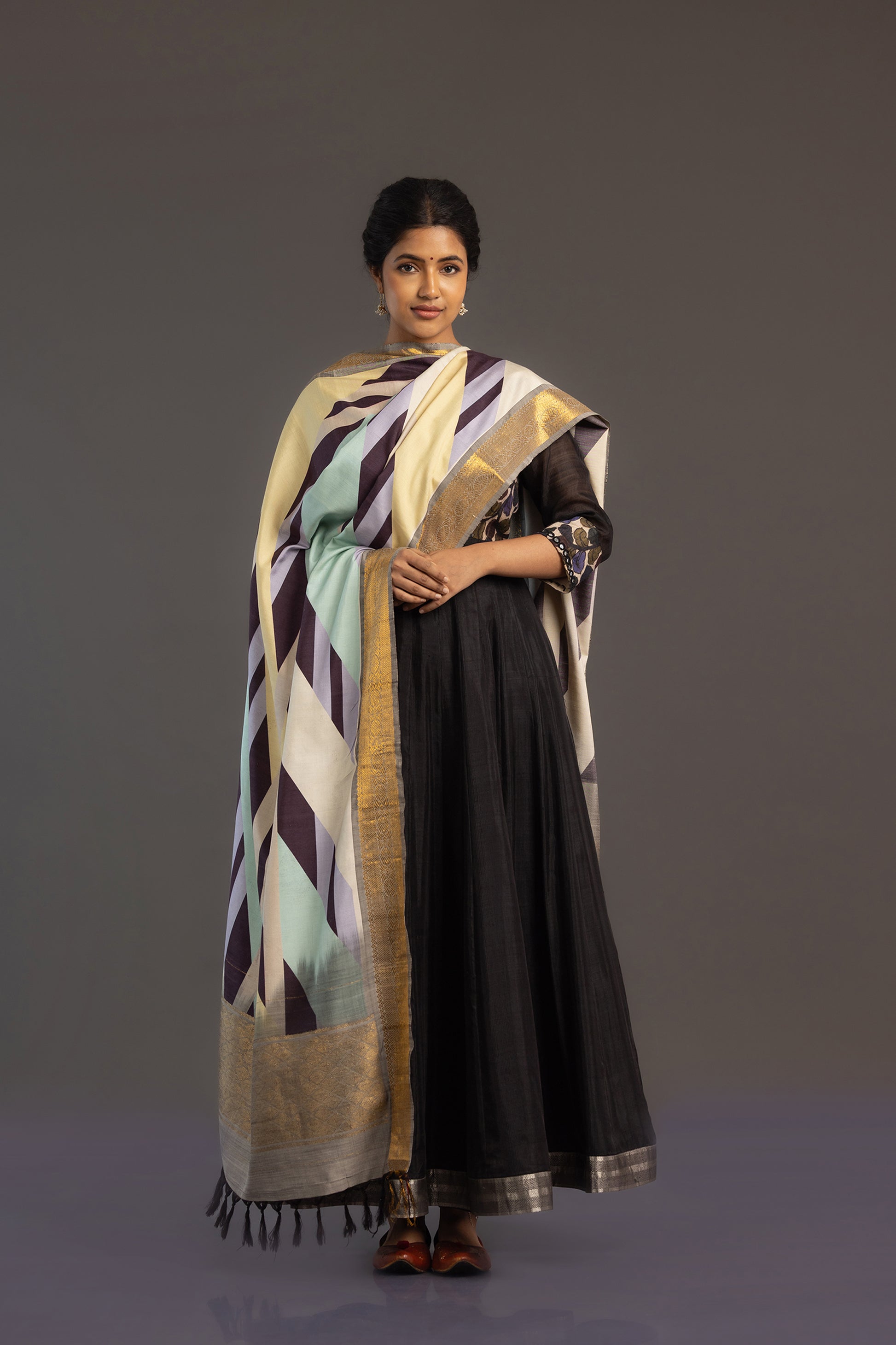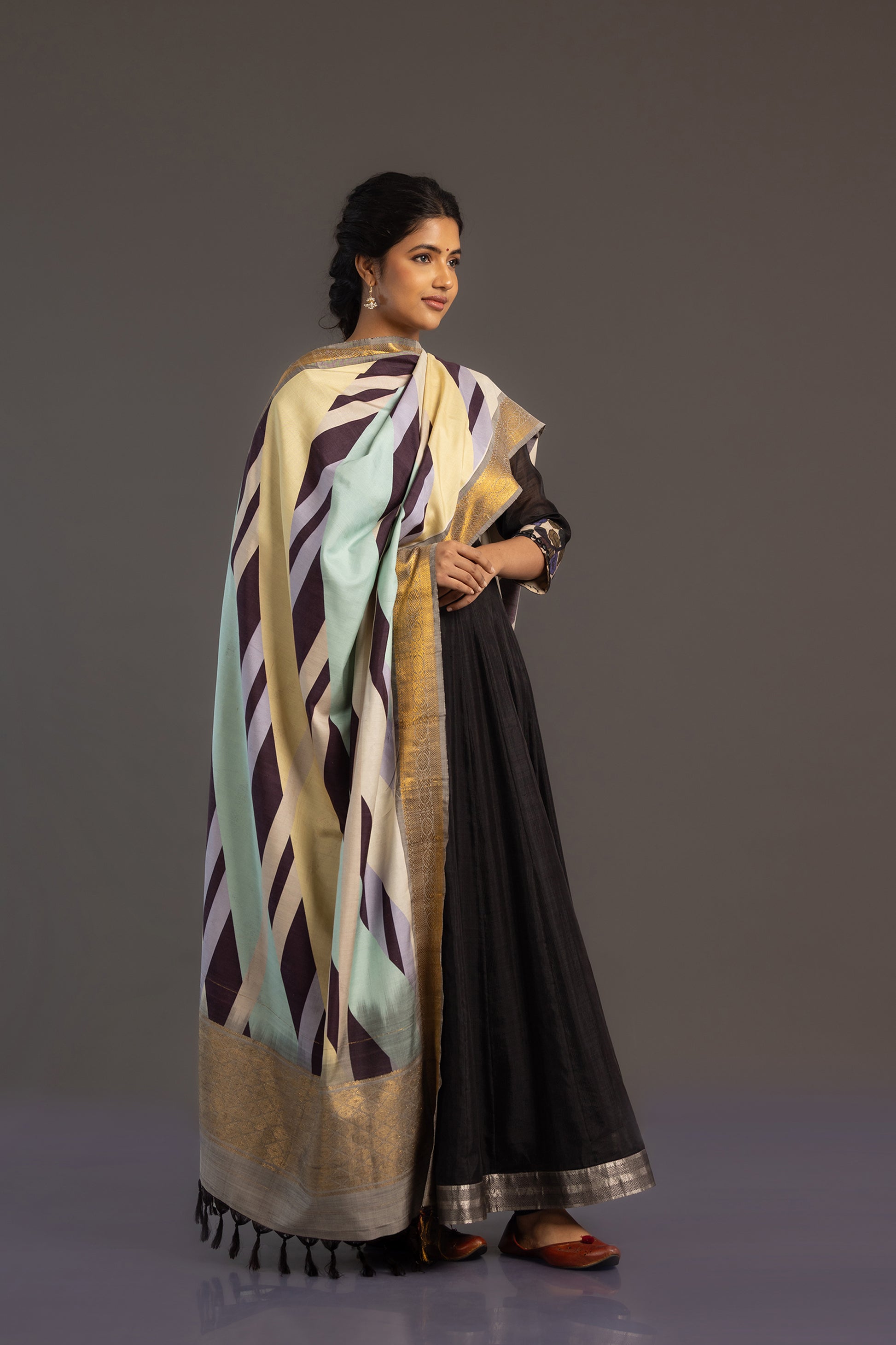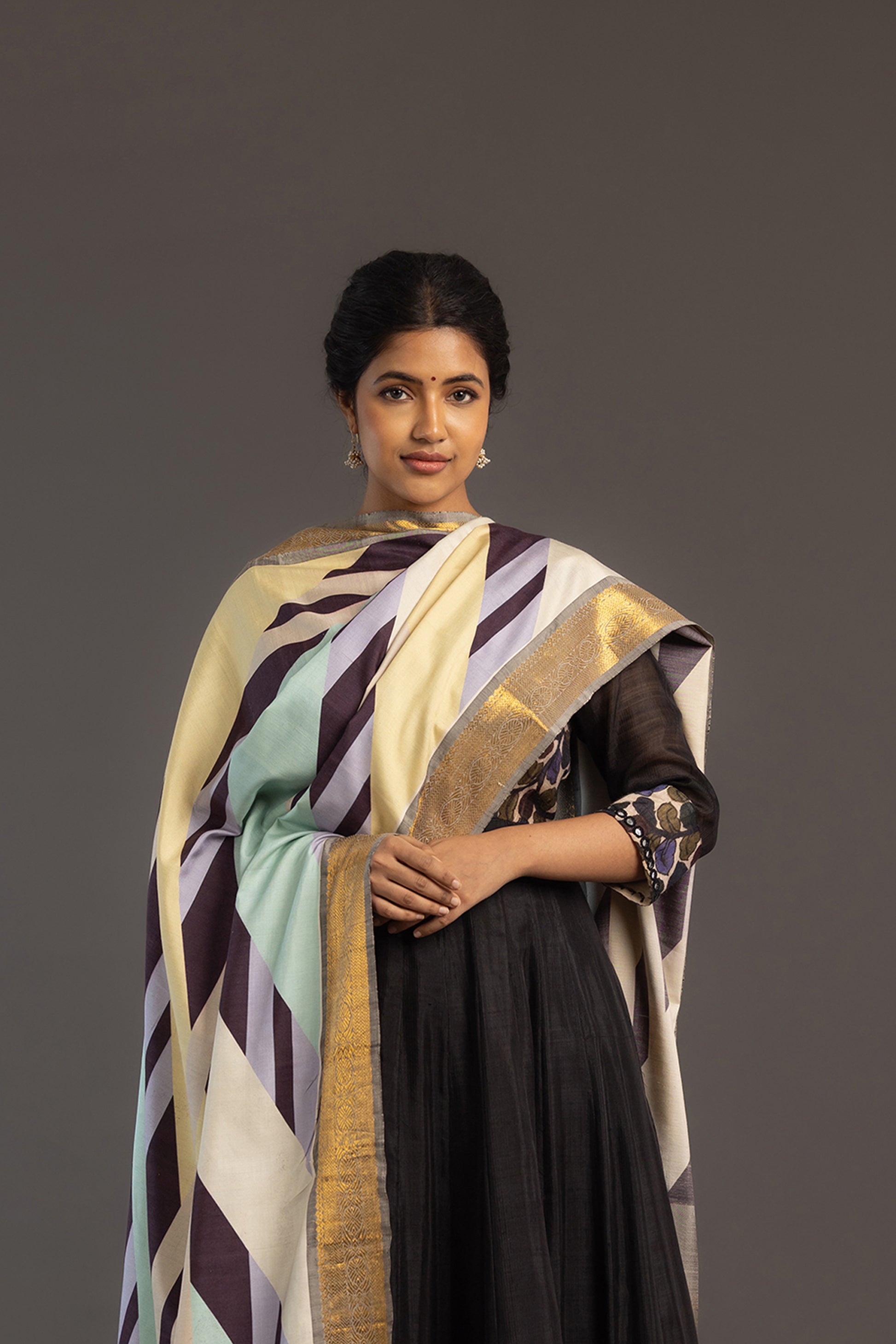 Handwoven Kanjivaram dupatta printed with abstract multicolored stripe art. Gray Kanchi border woven with Zari featuring Rudraksha designs and chevron stripes. Pallu woven with a geometric check pattern.