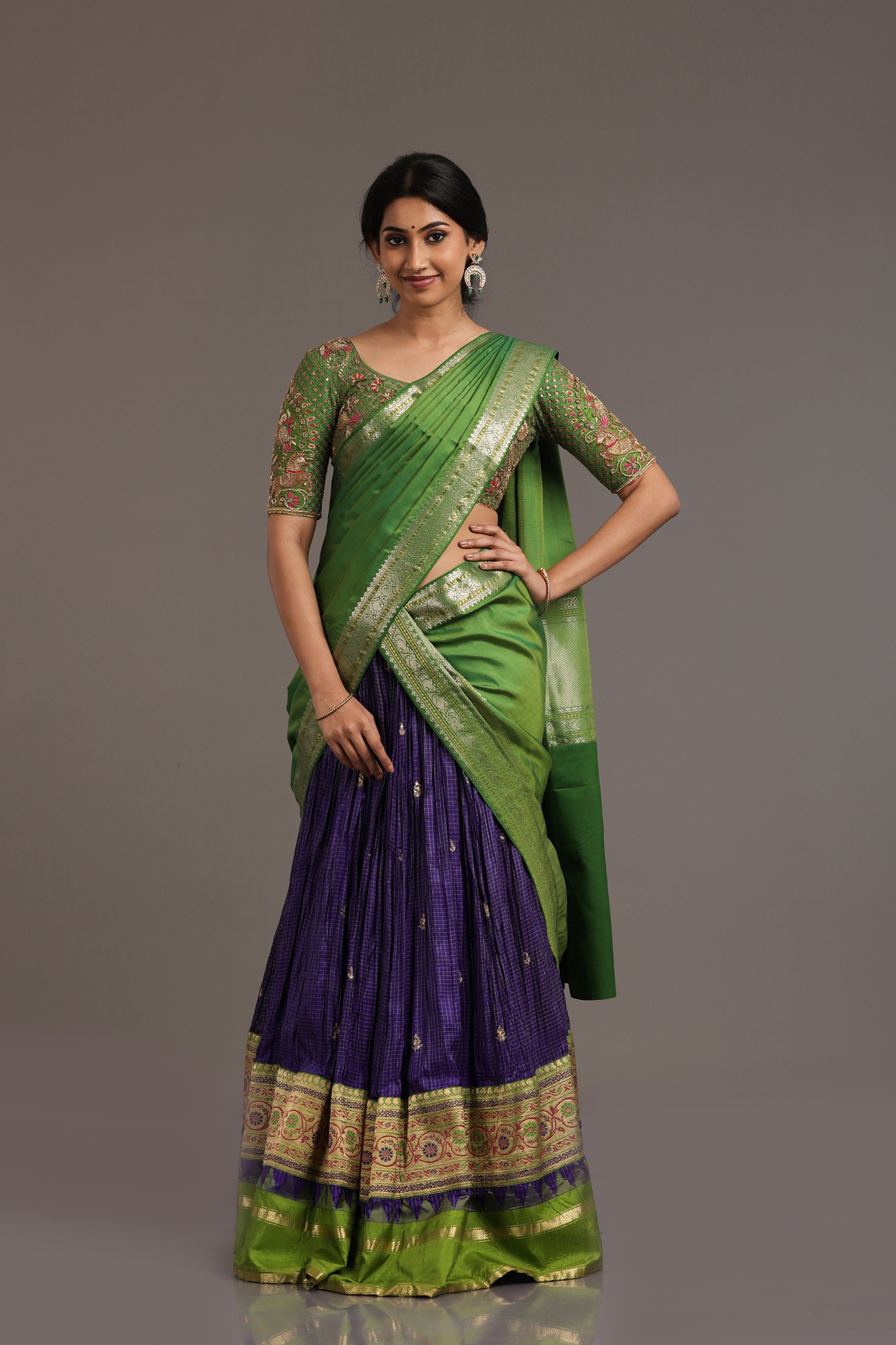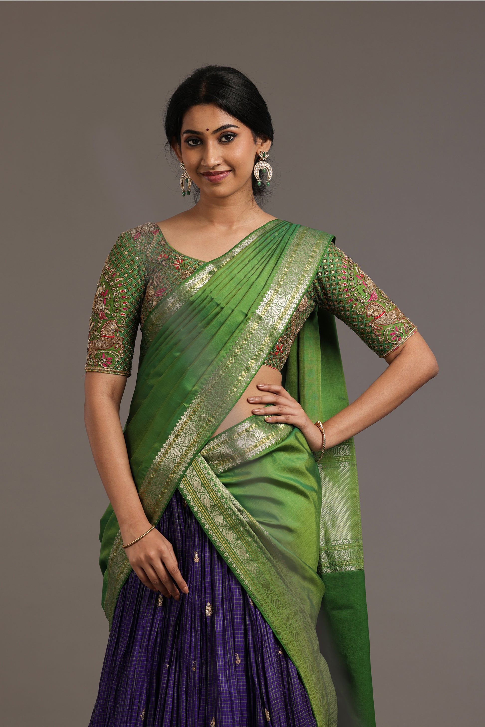 A handwoven Kanjivaram green dupatta with a classic Zari paisley border adds to the half saree look. The dupatta margins are painstakingly finished with a Kanchi Zari panel, which adds to its richness. The pallu has a connected green silk panel woven with Zari designs, giving it a distinct and sumptuous appearance.